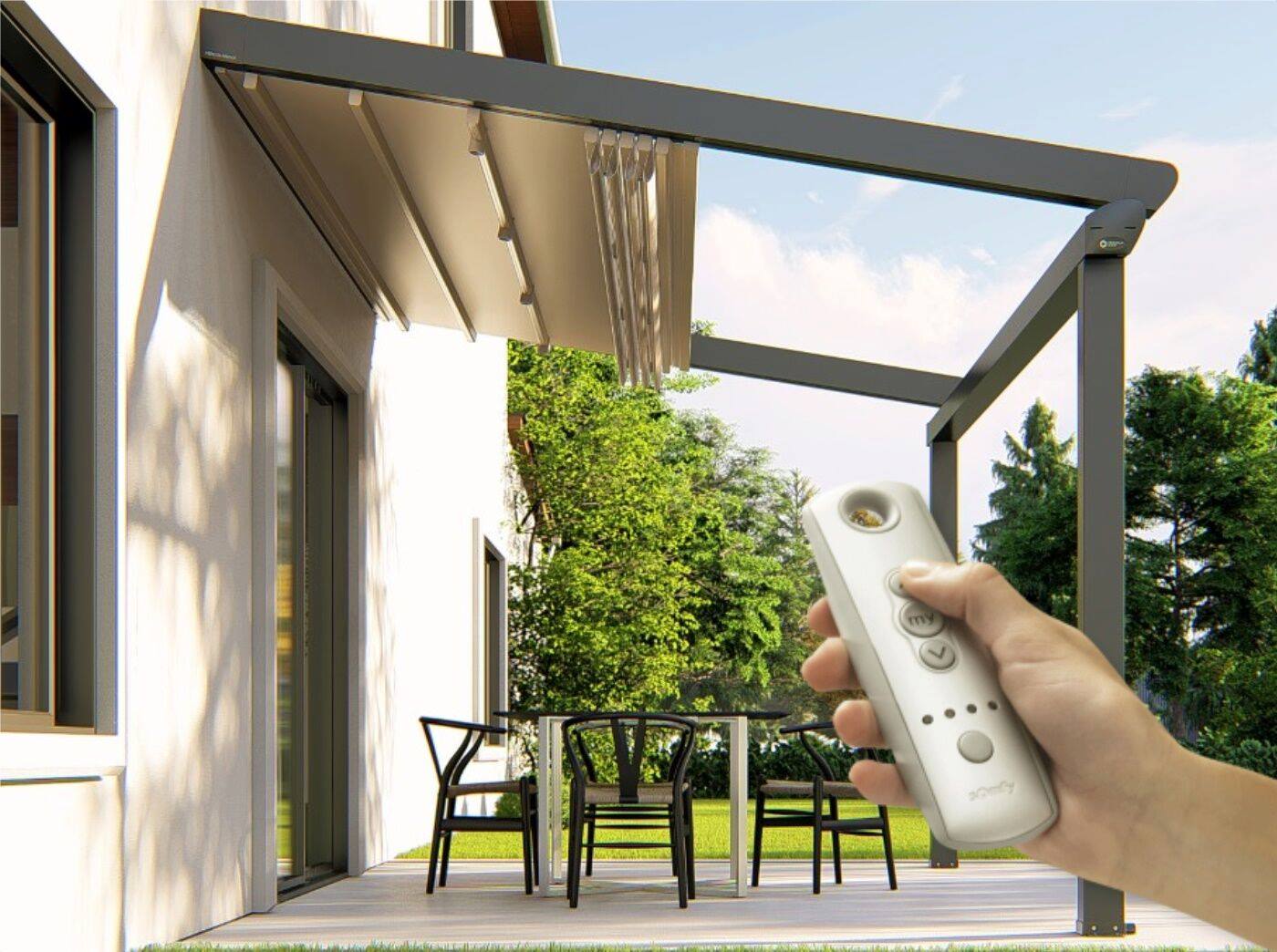 Mái hiên điều khiển từ xa là dạng mái hiên di động có khả năng che nắng, che mưa và vận hành bằng motor tự động kết hợp remote. Về thiết kế và công dụng, chúng tương tự các loại mái che thông thường, nhưng ưu điểm vượt trội nằm ở khả năng mở – thu linh hoạt chỉ với một nút bấm.
