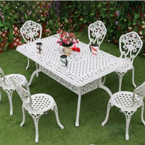 Bộ bàn ghế nhôm đúc ngoài trời gồm một bàn hình chữ nhật có kích thước 150*90*73cm và 6 ghế 45 *52*87cm cả bàn và ghế ngồi đều được thết kế mặt lỗ và các họa tiết hoa văn rất cân xứng và mềm mại để tạo nên một vẻ đẹp duyên dáng và nét sang trọng quý phái và thanh lịch… Kiểu dáng thiết kế độc đáo, ấn tượng trong các đường nét tỉ mỉ chi tiết giúp những mẫu bàn ghế nhôm đúc luôn được thu hút người xem từ cái nhìn đầu tiên, bàn ghế nhôm đúc khác hẳn với các chất liệu thông thường khác như gang sắt có thể bị gỉ, gỗ dễ bị mục. còn nhôm đúc là chất liệu được khắc phục cả hai nhược điểm trên, bàn ghế nhôm đúc có độ cứng cáp và bền bỉ chịu lực tốt không bị mài mòn hay gỉ sét trước thời tiết nhờ lớp sơn tĩnh điện cao cấp cùng với thiết kế chính xác, đã cho chúng ta thấy được khả năng chịu lực bền bỉ trước mọi tác động của thời tiết.