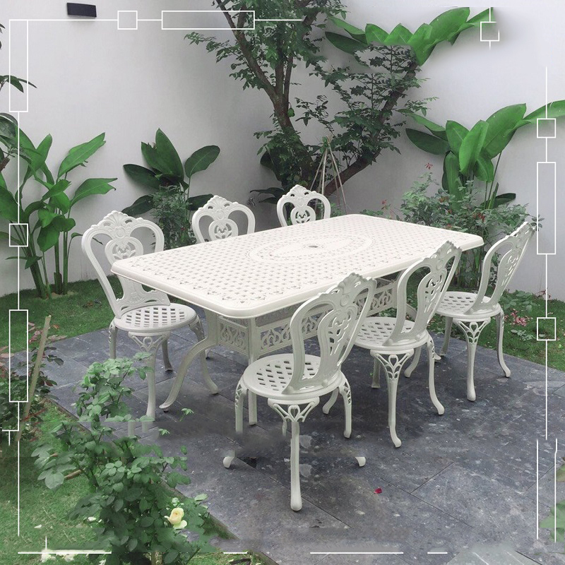 Bộ bàn ghế nhôm đúc ngoài trời gồm một bàn hình chữ nhật có kích thước 150*90*73cm và 6 ghế 45 *52*87cm cả bàn và ghế ngồi đều được thết kế mặt lỗ và các họa tiết hoa văn rất cân xứng và mềm mại để tạo nên một vẻ đẹp duyên dáng và nét sang trọng quý phái và thanh lịch… Kiểu dáng thiết kế độc đáo, ấn tượng trong các đường nét tỉ mỉ chi tiết giúp những mẫu bàn ghế nhôm đúc luôn được thu hút người xem từ cái nhìn đầu tiên, bàn ghế nhôm đúc khác hẳn với các chất liệu thông thường khác như gang sắt có thể bị gỉ, gỗ dễ bị mục. còn nhôm đúc là chất liệu được khắc phục cả hai nhược điểm trên, bàn ghế nhôm đúc có độ cứng cáp và bền bỉ chịu lực tốt không bị mài mòn hay gỉ sét trước thời tiết nhờ lớp sơn tĩnh điện cao cấp cùng với thiết kế chính xác, đã cho chúng ta thấy được khả năng chịu lực bền bỉ trước mọi tác động của thời tiết.