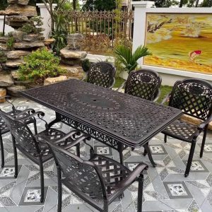 Bộ bàn ghế sân vườn nhôm đúc HCN-2M với kích thước có chiều dài là 2m chiều rộng 1m, chiều cao 73cm, với kích thước này có thể ngồi được với từ 8-10 người, đây là một kích cỡ phù hợp nhất với những gia đình có sân vườn rộng và đông người hay tổ chức những buổi tiệc ngoài trời cùng gia đình và bạn bè.