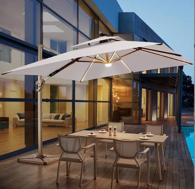 Ô lệch tâm có đèn 3x3m hợp kim có đèn dạng sao đế nhựa đổ nước dùng để trang trí sân vườn bạn có thể xoay và điều chỉnh mọi hướng, nấc xoay 360 độ giúp bạn dễ dàng điều chính theo hướng nắng một cách thoải mãi và mang đến khả năng che nắng hoàn hỏa nhất, bạn có thể điều chỉnh ô nghiêng theo ý muốn mà không cân mất thời gian để dịch chuyển cả chân đế của ô.